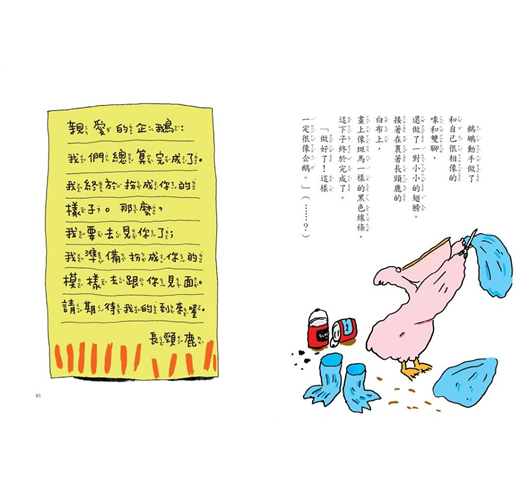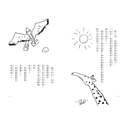 長頸鹿等啊等,等到脖子長長了五公分的時候,終於收到了企鵝的回信,從此他們開始通信,長頸鹿和鵜鶘不再無聊了。