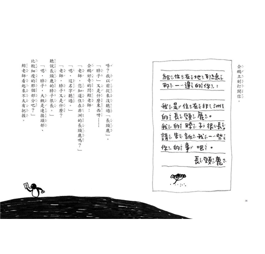「那麼,企鵝到底長什麼樣子?」長頸鹿相當好奇,甚至打算把自己扮成企鵝,到地平線那一邊的鯨岬去拜訪企鵝……