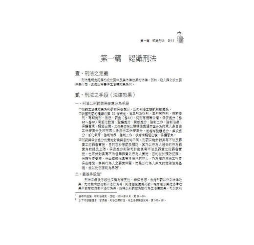 當然,因為以上的堅持,本書厚度依然足以作為正當防衛之用,畢竟筆者仍然堅持在一套完整的體系架構去貫穿整部刑法,且在各個議題均有詳細說明及舉例,甚至本書所舉的案例,幾乎都有完整解析說明,目的就是希望讓同學在沒有老師的情況下,也能透過自修的方式看懂本書並足以應付考試。當然,本書並非專門的解題用書,因此在案例的講解上是以較平鋪直述的方式來說明,若同學對於如何解題、命題者是如何用案例事實包裝考點,以及如何洞悉考點、掌握答題技巧有興趣,可以參考筆者的解題書—與刑法有約 解題趣-總則篇(也有分則篇喔),應該會有不小的幫助。