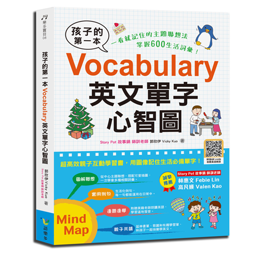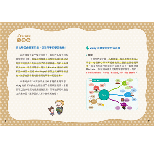由於Vicky老師經營自己的語言教室以及開設親子英語系列課程多年,她對於孩子的學習發展以及家長們常有的疑問,都十分有經驗和自己的一套辦法,所以在這本寫給家長帶著孩子學英語的書裡,有Vicky老師整理多年的教學好點子。由Mind Map呈現出來的主題,每一個主題有單字、句型、可以搭配的繪本和整理歸納好的網路歌曲資源,以及適合家長在家與孩子玩的活動。這本書提供每一位想陪伴孩子學習英語、一起共讀,甚至是在啟蒙道路上的家長,許多上手又實用的點子,我開玩笑地跟Vicky說:這真的是一本大補帖呀!