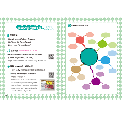 爸爸媽媽可以上網搜尋或掃描QR code進行互動學習。讓孩子在唱唱跳跳、剪剪貼貼的過程中,自然而然學會英文。此外,也可以帶著孩子製作屬於自己的單字心智圖,讓孩子發揮創意,自由發想。