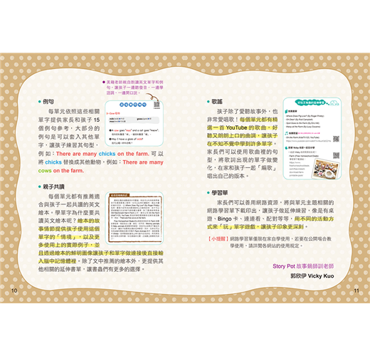 「Story Pot 故事鍋」臉書社團就是我們在廚房中討論教案時誕生的,裡頭記錄了我、Vicky Kuo和Valen Kao對英語繪本教學的經驗與想法。直到現在,Vicky的寶貝已經進入幼兒園,我的老師朋友們也在教學中紛紛找到了自己專精的領域。很高興看見Vicky除了用心教學、經營自己的貝爾英文教室和粉絲頁之外,也精心撰寫了這本書來讓更多家長和孩子們能快樂學英文,同時用多元的形式繼續累積她豐富的教學經歷。
