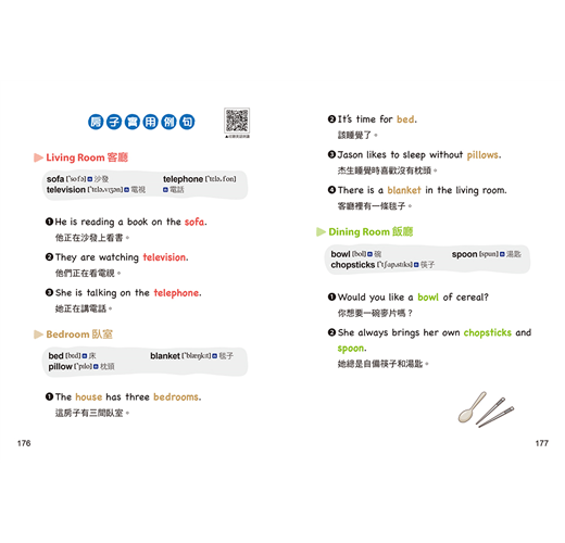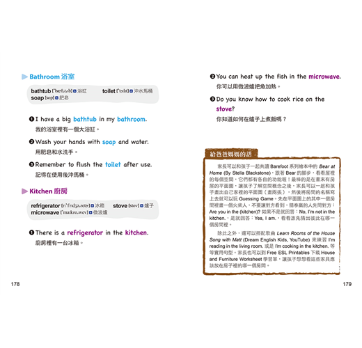 認識主題心智圖上的各種相關單字後,爸爸媽媽可以和孩子一起進階將單字放入例句中練習。生活化的實用句子,讓孩子能把學到的單字實際運用出來,一步步累積口說表達能力。