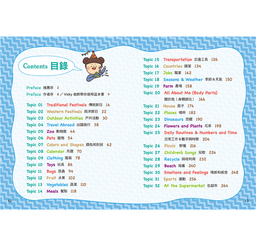 本書總共有32篇孩子生活中常見的主題單字,Vicky老師幫家長依主題整理了相關網路資源,家長們可以在家輕鬆地善用網路資源,帶著孩子用有趣的方式來練習,讓學習英文單字變得更有趣!