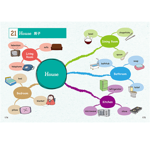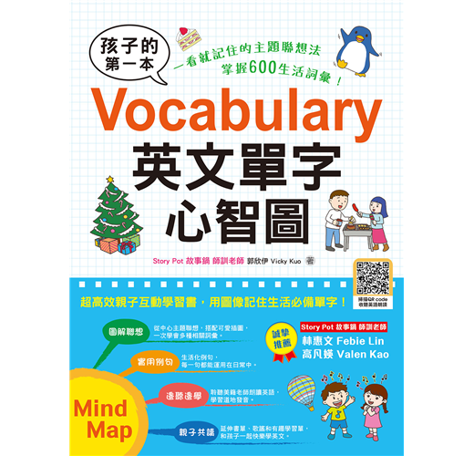 全書共收錄32個與孩子生活息息相關的主題,由核心主題發散出各種延伸單字,讓孩子一次學會與主題有關的日常用字。爸爸媽媽也可以在孩子閱讀心智圖前,先引導孩子想想看,該主題有哪些相關單字,訓練孩子的聯想力。