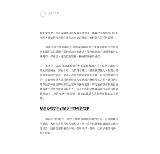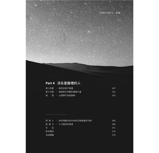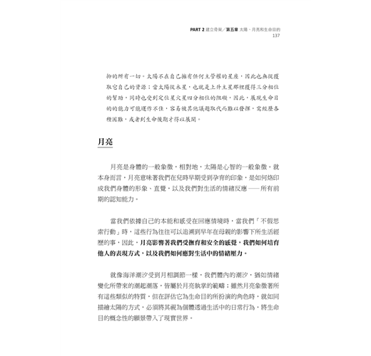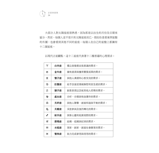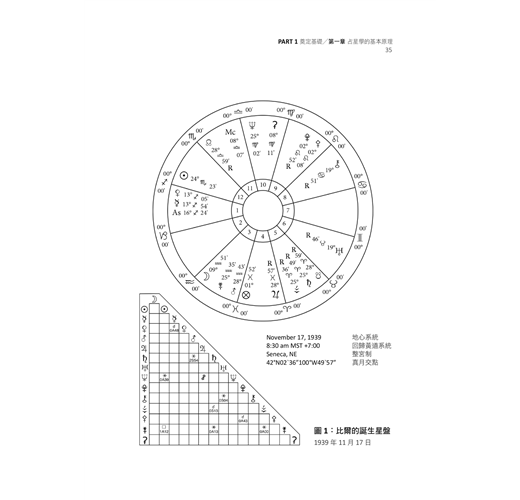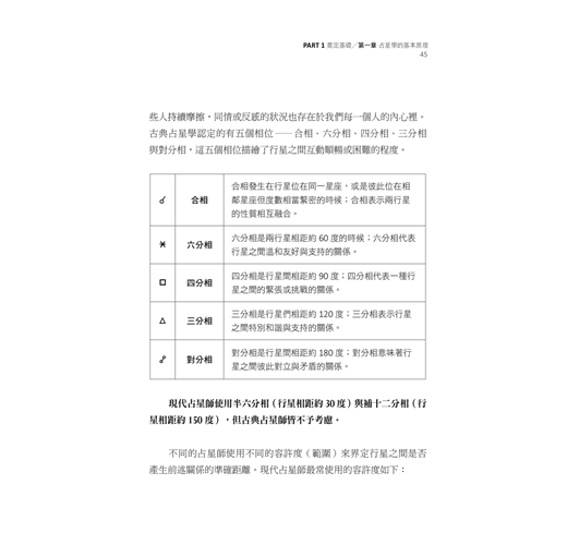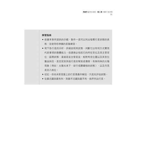 本書裡所提整星座相位、廟旺弱陷行星主管系統與行星的狀態判斷,都是有助於切入星盤核心議題的關鍵技術。
