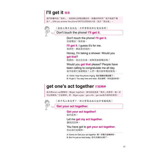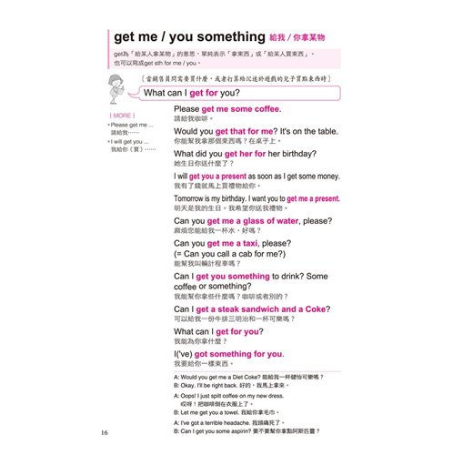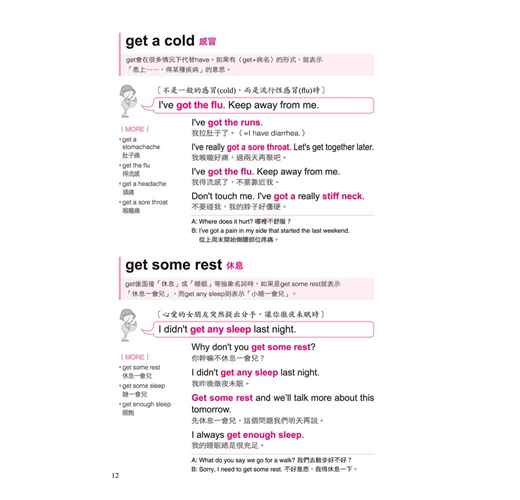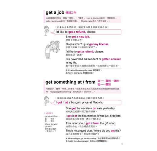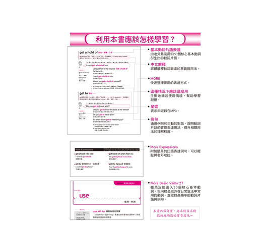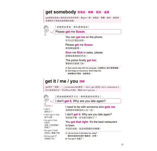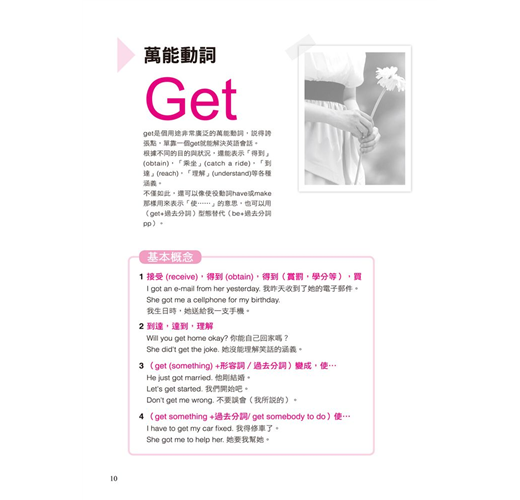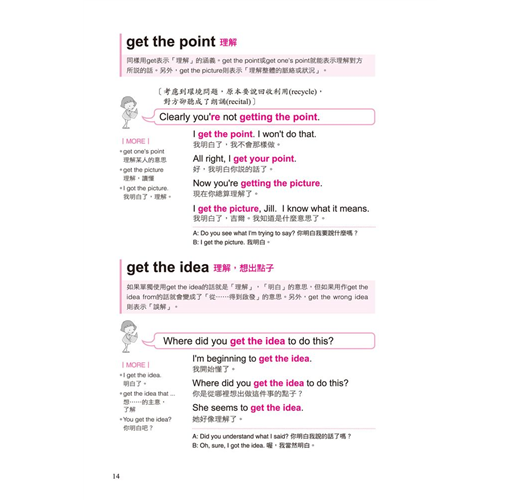 一個動詞能有幾個用法?全書不藏私的將動詞使用率破表的片語、表達方式,完整而詳盡的呈現,例如「Get」的使用方式:get a job、get something at/from、get a cold、get some rest、get the point、get one’s act together、get a minute、get the feeling、get a hold on、get mad、get lost等等。