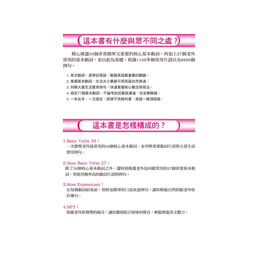 精心挑選50個非常簡單又重要的核心基本動詞,再加上27個老外常用的基本動詞,並以此為基礎,收錄近1200個常用短語以及8000個例句表達,不用教科書,英語一樣頂呱呱!