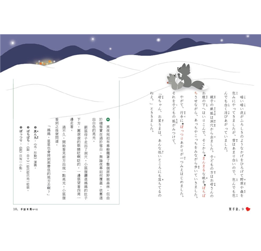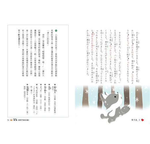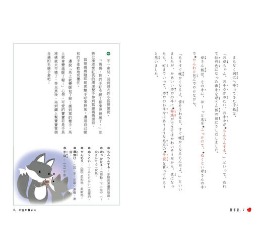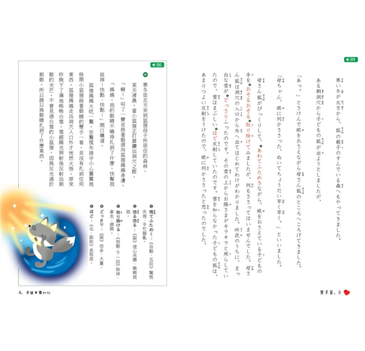 富含劇情的故事內容可以讓學習語文更有動力,閱讀中不僅能學到單字、語法、句型等,由閱讀再延伸到朗讀可以讓發音更標準、表達更流暢、用字更精準,搭配上山本峰規子的可愛插圖,讀者能更輕易地進入新美南吉的童話世界。