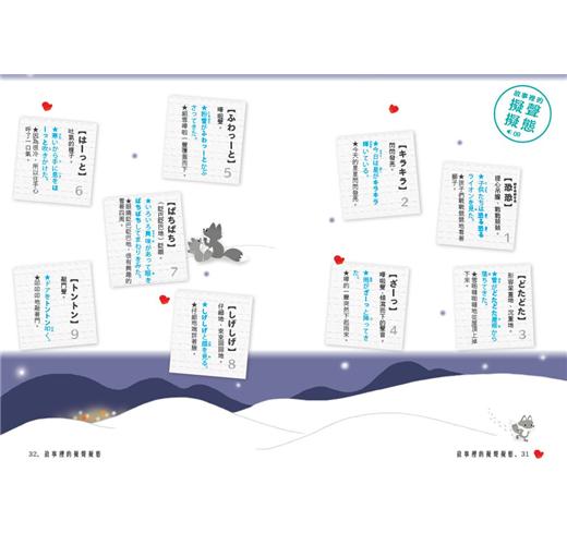 各篇章後面,特別挑出故事中的擬聲擬態語作統整學習。擬聲擬態語的運用會使情境更加生動豐富,學會常用的擬聲擬態語可以讓日常生活中的談吐變得活潑有趣。內文中,不時還會穿插一些相關小知識,得以在閱讀的同時對故事背景有更深入的了解。