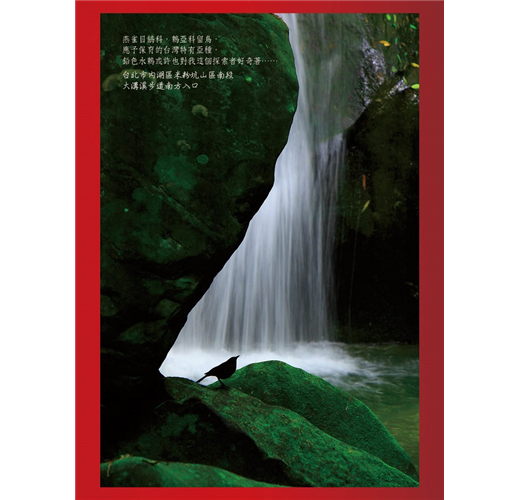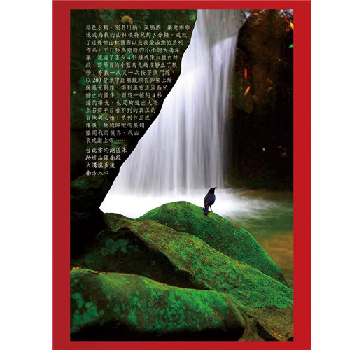 而我早已習慣各處的山林都像是我的師長,總是殷殷教導著我並耐著性子聆聽我的心。山林更彷彿是不曾背棄我的朋友,無論我是否須要,也不管時機如何,它都大大歡迎著我走進擁有許多不同面向的山間、林中:茂密的中級山闊葉木原始林、蒼勁的高山雪松、雲杉和台灣翠柏、大雨時現身小雨時極其羞怯的高、低海拔時雨瀑、山林攝影同好中有著小小美名卻少為人知的祕境瀑布……,而台灣山林中很經典的,是燕雀目鶲鶇亞科等至少十餘種常見留鳥,在各個城鎮周邊山澗,不論晨昏晴雨,總是娉娉巧鳴著的迴音。