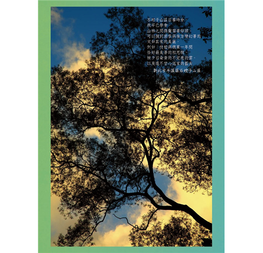 本書中唯美的作品當然不少,但我作為一個希望貼近真實也不太在意市場反應的攝影者,本不願作品完全唯美,而是要呈現深度並講述──或讓讀者自己閱讀到──圖像中未說出的故事……。本書中每張作品外框儘量「馬卡龍」(Macaron,源於義大利的多彩法式小圓餅)化,目的在於讓即使是艷陽天也常是陰鬱著的島上蓊鬱山林活潑多彩一些。而許多鄰近村落不甚原始的台灣山林中,「嫌惡設施」其實不少:水管、電線桿與電線纜線、水泥護欄樁柱等等,曾經是我的風景寫真學習對象,幾位知名日籍攝影師們,均統稱的嫌惡設施,於其作品中總是要避之唯恐不及,才是真正呈現了日本山林之美。然而嫌惡設施就是生活設施,就是山林周邊與其中的人們生活的一部份,雖然確實極可能傷及一幀被攝影者仔細構圖下的作品與其藝術價值,我的想法卻是:日常生活必要的「嫌惡設施」可以看起來不嫌惡嗎?可以恰好呈現在作品中且有藝術價值嗎?是否已將拍攝當天的場景裁剪具象之後,傳遞了某種感動給讀者?因此本書中我不迴避地拍攝了少許水管、長長的電線與並不美的電塔,甚至於古墳與山間墳場,我還挺喜歡這幾幅作品,或許在山林攝影久了,景物的美醜與否,不僅在於攝影構圖的技巧,更是創作的觀點與欣賞的心境吧!