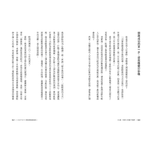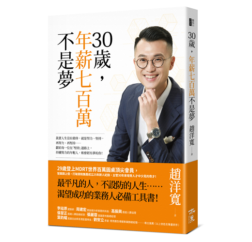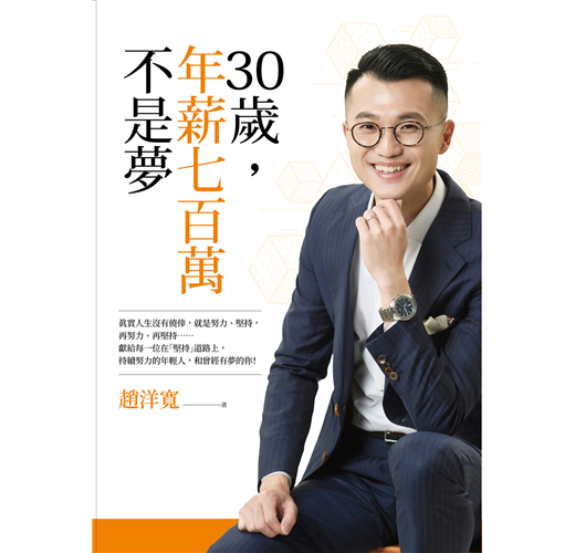 看到書名,覺得取得真好——《三十歲,年薪七百萬不是夢》,洋寬永遠把自己訂在最高點,看似不可能的目標,永遠挑戰達成,就像書中所說的,沒有不可能;努力、奮鬥,用結果認證。