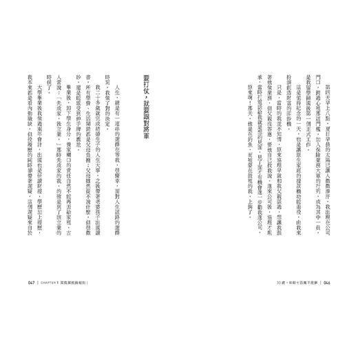 從小,我一直是大家眼中的乖乖牌,從求學到出社會,和許許多多的年輕人一樣,承載著父母的期待,活在俗世眼界的框架內,並在家人的庇護之下,過著頗為平順安穩的人生。看似平淡無味,但過去所累積的點滴,仍是我人生中很重要的養分。直到我出國留學,到外面去看了世界,才讓我有了重大轉變。海外求學經歷,讓我體會到自己是如此地渺小,也不禁讓我思考著,為什麼不讓自己活得精采一些?這樣的想法一旦出現,就讓我更珍惜自己所擁有的每一天。
