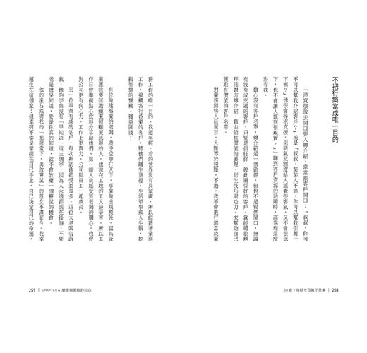 2. 從生嫩排斥業務工作,至漸入佳境,歷經挫折跌倒、再奮起!全書娓娓道來一步一腳印的成功之路,情感真摯。作者希望以他現在的熱度和親身經歷,廣邀台灣年輕人一起衝;進入職場一段時間的人也能受到感染,重拾當初的熱情。