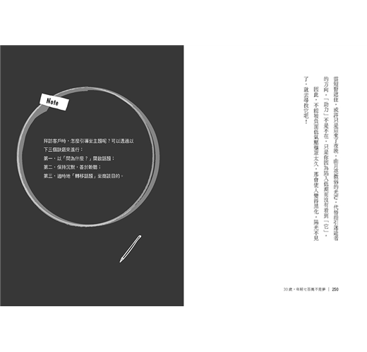 記得第一次獨自與客戶拜訪聊天時,有些緊張,我一開頭就問對方:「您的事業做得這麼成功,當初為什麼會選擇這個產業呢?」在對方侃侃而談後,我又陸續拋出問題:「管理這麼大的體系,很不容易,要怎麼帶人?」