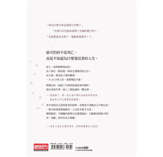 這本書所書寫的大部分內容,是我在二○一七年確診為乳癌第三期後,一直到癒後的完整紀錄;整個歷程,前後加起來大約是一年的時間。在這一年中,我雖然沒有辦法像生病前一樣用正常的頻率工作,但只要體力、氣色、精神等各方面都還不錯的話,我就會抱持分享的心情,拍影片上傳,給長期關注我或是喜歡我的網友們,讓大家知道我的近況,同時也分享重大傷病患者亦能使用的美妝與保養資訊。
