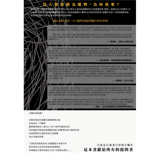 「讀一位亞斯者的「選擇意志」,和一路「肉搏戰式的反省」,能看出這群思考模式異於一般人的「魔物」人生挑戰有多大! 」——呂熙莉(家長、中華民國自閉症基金會執行董事)