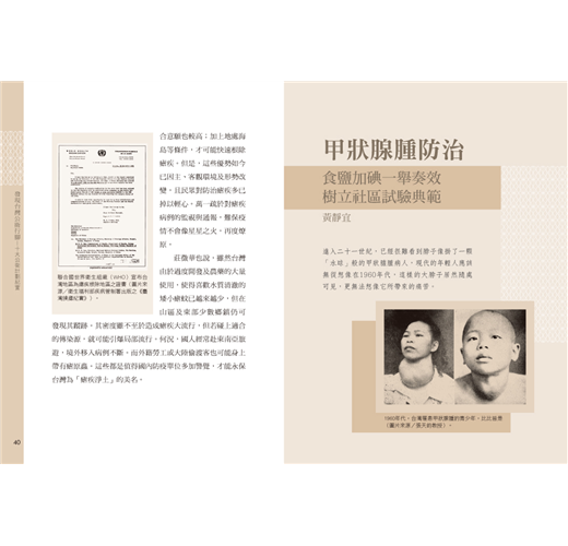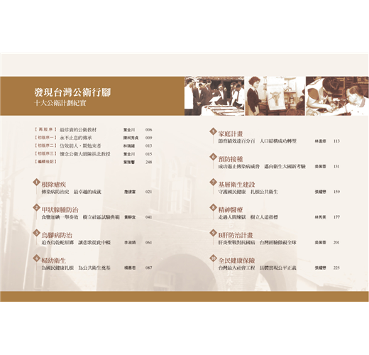 另外,編輯委員在討論過程中,日據時代的鼠疫防治、天花防治、鴉片斷禁及引進西洋醫療等,俱為台灣醫療、乃至社會發展的關鍵衛生政策,值得推崇。尤其在醫療建設方面,包括成立台灣病院(台大醫院前身)、建置十一大省立醫院等,在當時都是很重要的進展,奠定了日後台灣醫療體系的根基。然而,因史料蒐集耗時費力,礙於種種條件限制,未將之單獨成立章節,但無可否認的,這一時期的確是台灣公共衛生萌芽的重要里程碑。