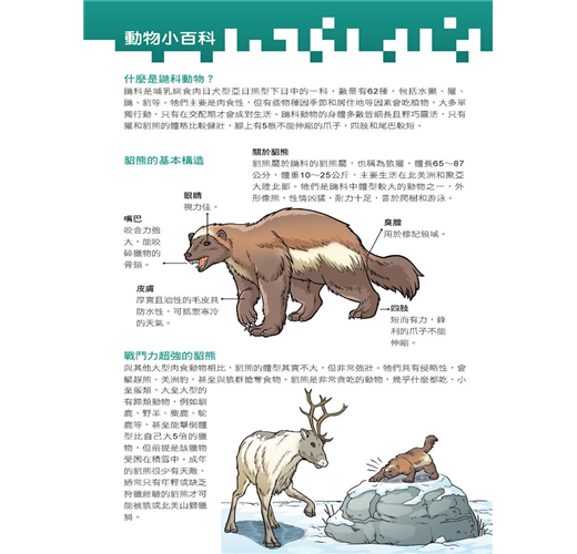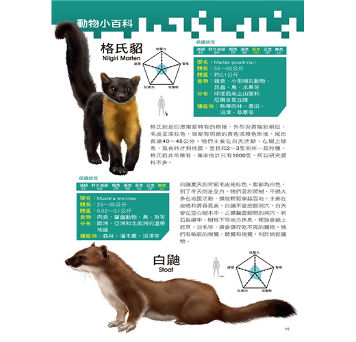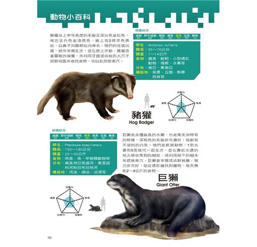 STEP 2知識專區∣科學性★★★★★設有「動物小百科」單元,特別介紹鼬科動物的構造與小常識,以及海獺、巨獺、豬獾、虎鼬、非洲艾虎、黃喉貂等動物的超炫常識,讓小朋友有系統的學習。