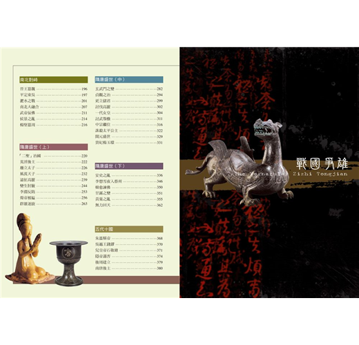 ●全書將《資治通鑑》的內容分為戰國爭雄、天下一統、楚漢相爭、大漢天下、三國鼎立、南北對峙、隋唐 盛世、五代十國等八大部分,使讀者能夠依照朝代按圖索驥,便於查詢與閱讀。