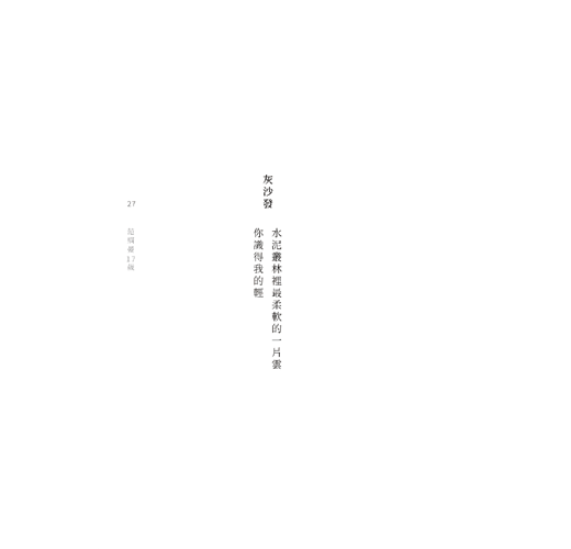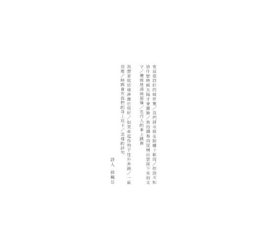 在這座詩控的城市裏/我們肩並肩在騎樓下躲雨/你說不知道什麼時候太陽才會露臉/我抬頭看向從積雨雲落下來的文字/優雅地滑過屋簷/在行人的傘上跳舞