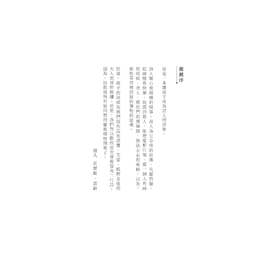 於是,孩子的詩成為我們這些活在恐懼、失愛、紙醉金迷的大人世界的救贖。於是,我們得以歡欣這世界還留有二行詩,因為,詩歌將所有被囚禁的靈魂釋放開來了。