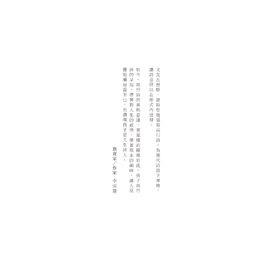 如今,兩行詩的美與意涵,更璀璨的顯現於此,孩子兩行詩的呈現,帶著對人生的感悟,帶著雋永的韻味,讓人反覆咀嚼迴盪不已,也讚嘆孩子是天生詩人。