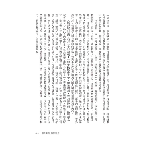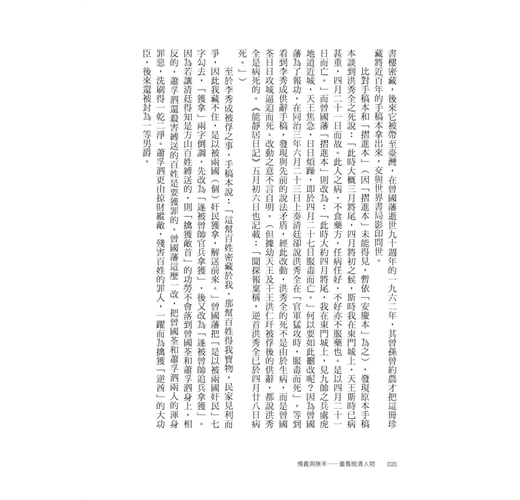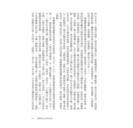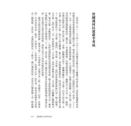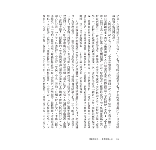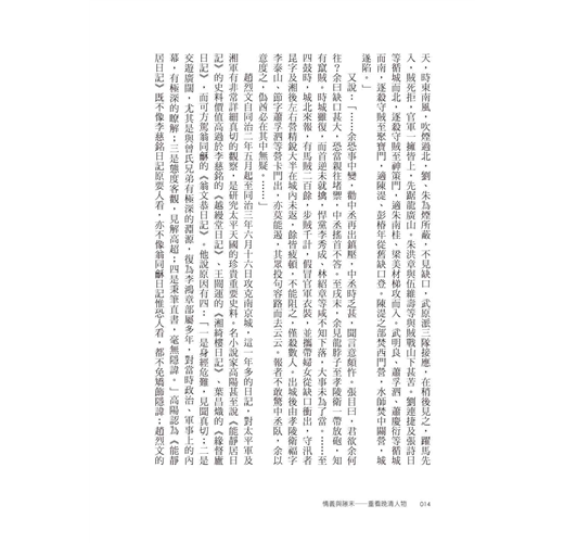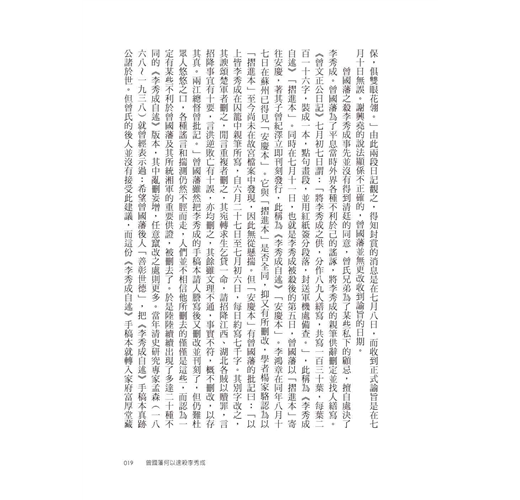 基於此,本書的寫作特別關注於一些細節,例如趙烈文的《能靜居日記》是研究太平天國的珍貴重要史料。但該日記長久以來一直躺在圖書館的故紙堆中乏人問津,後雖有影印本問世,但是因為趙氏字跡自由奔放,屬行草風格,宛如「天書」,讀者辨識不易。後來湖南嶽麓書社費數年之功,在二○一三年七月推出標點排印本,終於讓我們得見南京城被攻破,李秀成被俘的種種情況。趙烈文忠於史實,無所隱諱,宛如一優秀的戰地記者般地忠實報導。再加上李秀成在囚籠中親筆所寫的《李秀成自述》手稿本,被曾國藩後人密藏將近百年,他的曾孫曾約農帶來臺灣才在一九六二年交與世界書局影印問世。而我們先前所看到的是曾國藩將李秀成的親筆供辭刪定並找人繕寫而後刊刻發行的「安慶本」。如今能以手稿本去比對刪去的部分,再證之當時趙烈文親見親聞所寫下的日記,將可「逼近」歷史的真相。
