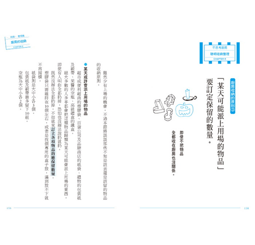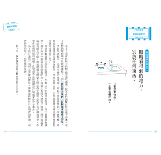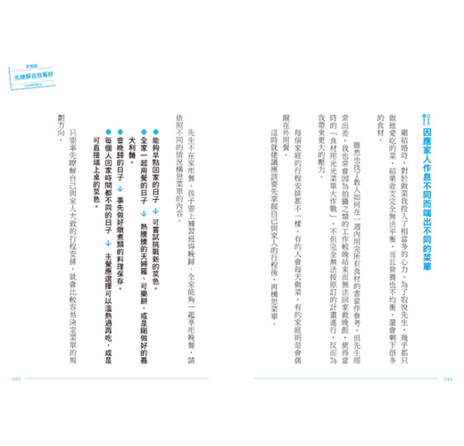 ◎雖然最近生了頭一胎,但生活上的巨大改變,讓我欣喜的時間不長。就在忙於準備嬰兒副食品、幫先生做便當、還要為每天三餐傷神的日子裡,我發現了這本書。尤其,當我讀到書中強調「做家事就好像上班,『程序』很重要」的描述時,真的深有同感!在慌亂中有了這本書的陪伴,我頓時感覺心中出現一道光芒。(33歲‧新手媽媽)