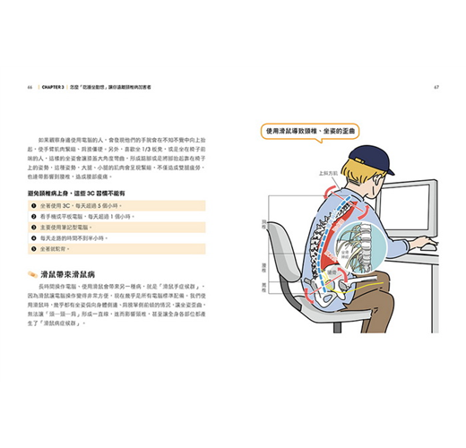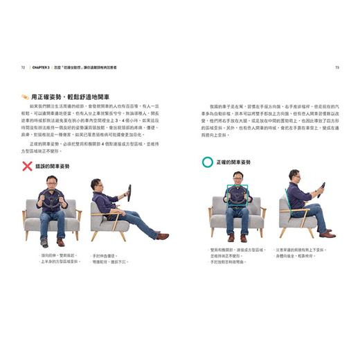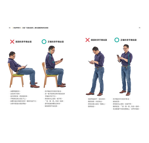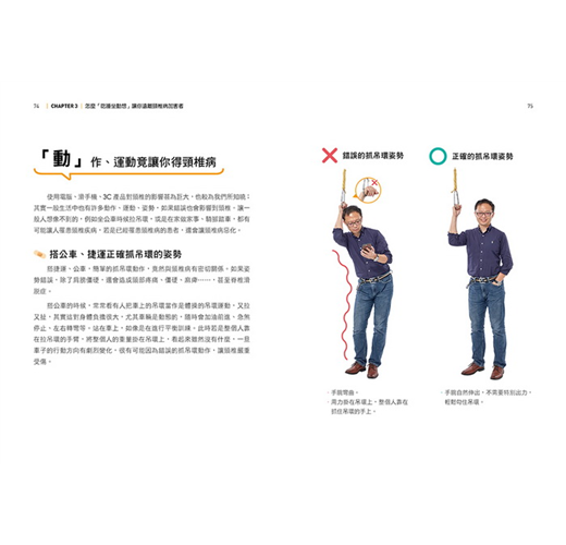 打電腦、開車、滑手機、搭公車拉吊環等,林頌凱醫師親自示範,搭配圖文標示說明、對錯姿勢比較,姿勢對了,生活感就對了!