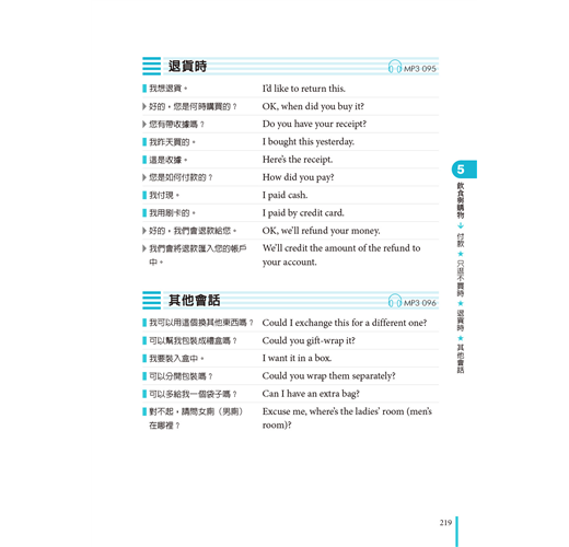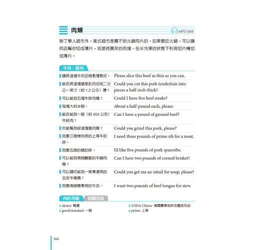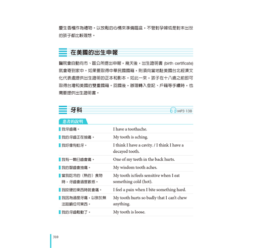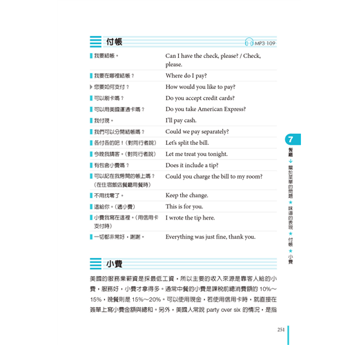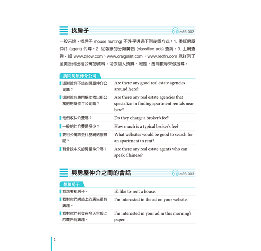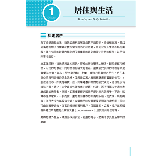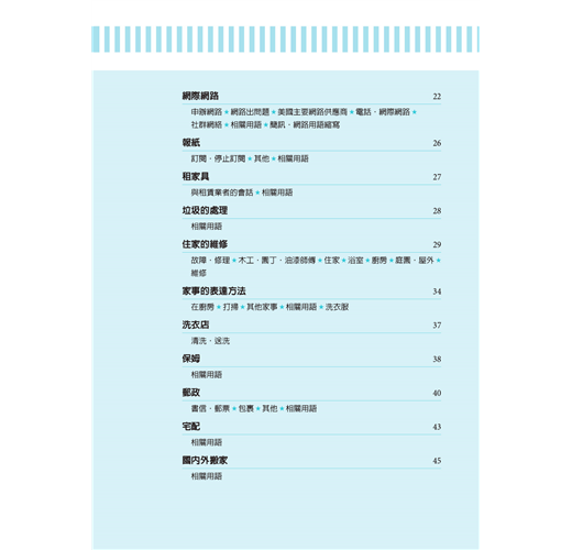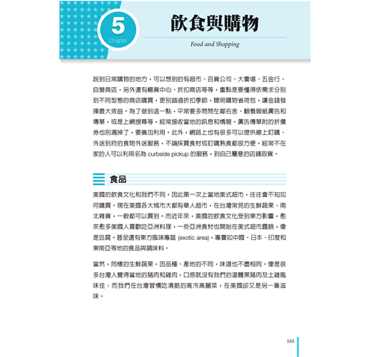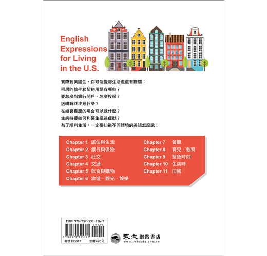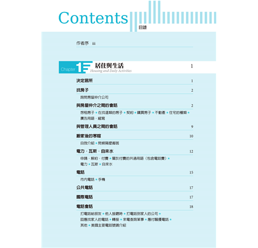 書中整理美國租房、開戶、投保、網路申請、飲食購物、教育制度、醫療體系及文化習慣等最新情報,並收錄 340 個貼近日常生活的會話情境,對應不同類別,補充超過 10,000 個相關單字。此外,專業外籍老師錄音長達210分鐘,並提供線上免費下載,幫助讀者用聽的學習生活例句及會話。
