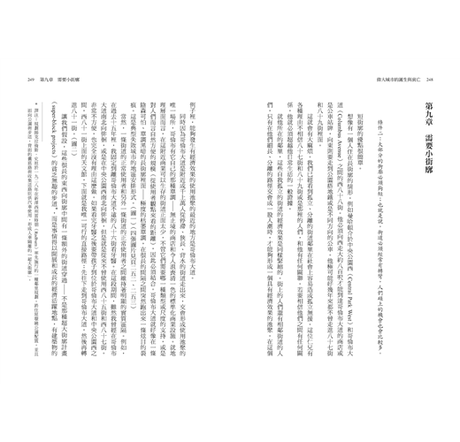 再次注意到這本書,是好多年後在世貿書展買的一本由紐約市立圖書館出版的《世紀好書》(The New York Public Library’s Books of the Century)(牛津大學出版社,一九九六年)中,對於這本書的介紹。《世紀好書》是紐約市立圖書館為了慶祝該館的百年紀念(一八九五—一九九五),從六百二十萬冊的所有館藏中選出十二類共計一百六十七本的各類經典好書。珍‧雅各的《偉大城市的誕生與衰亡:美國都市街道生活的啟發》赫然名列「經濟與技術」類十一本經典名著中的其中一本,其他十本並列的當代經典分別是托爾斯坦‧韋伯倫(Thorstein Veblen)的《有閒階級論》(The Theory of the Leisure Class: An Economic Study of Institutions, 1899)、馬克思‧韋伯(Max Weber)的《基督新教倫理與資本主義精神》(The Protestant Ethic and the Spirit of Capitalism, 1904)、亨利‧亞當斯(Henry Adams)的《亞當斯論教育》(The Education of Henry Adams, 1907)、約翰‧凱恩斯(John M. Keynes)的《就業、利息和貨幣的一般理論》(The General Theory of Employment, Interest and Money, 1936)、菲德列克‧海耶克(Friedrich August von Hayek)的《通往奴役之路》(The Road to Serfdom, 1944)、彌爾頓‧費德曼(Milton Friedman)的《消費函數理論》(A Theory of the Consumption Function, 1957)、約翰‧加爾布雷斯(John Kenneth Galbraith)的《富裕社會》(The Affluent Society, 1958)、海倫‧李維特(Helen Leavitt)的《超級高速公路—超級惡作劇》(Superhighway—Super Hoax, 1970)、厄恩斯特‧舒馬克(Ernst Friedrich Schumacher)的《小即是美》(Small is Beautiful: A Study of Economics as if People Mattered, 1973)和艾德‧克羅(Ed Krol)的《整個網際網路:使用者指南與目錄》(The Whole Internet: User’s Guide & Catalog, 1992)。