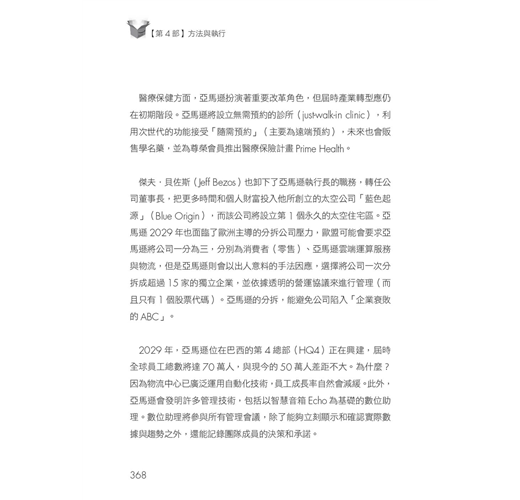 提到數位時代的王者,許多人腦中最先浮現的都是亞馬遜這家公司。近年來,亞馬遜涉獵的領域愈來愈多,實體商店、人工智慧、物聯網等,均可見到這頭巨獸的蹤影,為什麼它得以縱橫全球?究竟傑夫.貝佐斯(Jeff Bezos)領導公司業務成長、開發創新乃至於擴大規模的方法為何?