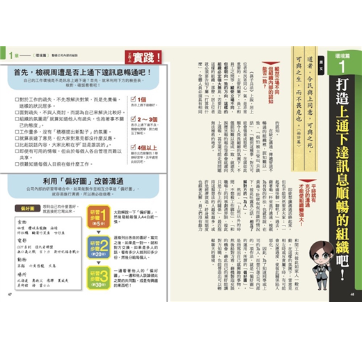 「道者,令民與上意同,可與之死,可與之生,而不畏危也。」這句話是提醒你要注意公司或是組織內部的認知是否一致。但是實際上要如何執行?作者貼心的附上了檢查表,8個項目,你逐一檢查,就可以知道你的公司是離心離德,還是萬眾一心。
