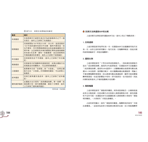 任何人的股市投資經驗都值得參考的。不過你要小心對方的成功是否為運氣好。本書則利用台股歷史資料庫,對本書提出的理財方法進行回測。在回測的過程中考慮了7種偏差:先視偏差、短期偏差、存活偏差、風險偏差、小股偏差、成本偏差、資料操弄偏差。將之逐一排除,得到最可信的結論。