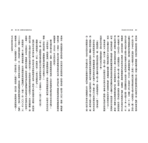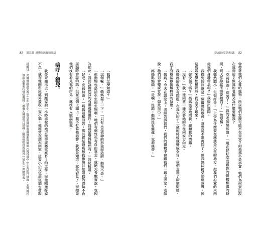 「但動物也是活生生的生物啊。牠們有個性也有自由意志,就絕大多數來說,也因為如此,我認為牠們真的有靈魂與靈性。我就是覺得牠們有。」我反抗道。