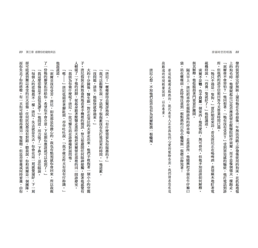 大約十分鐘後,醫生跟一對正在哭泣的夫妻走出來,他們手裡抱著一個小小的空籠子。唐尼假裝正興致盎然地看著手機裡的簡訊,努力想避開任何眼神接觸。接著他感覺有人輕碰了一下他的肩膀,便起身跟著獸醫走進昨天他把索爾留在那裡的同一間診療室。