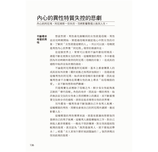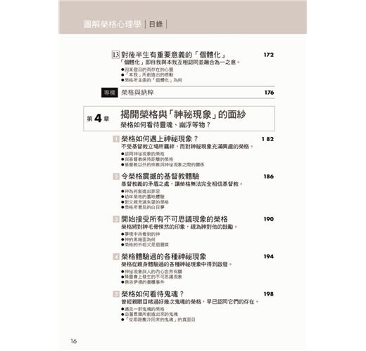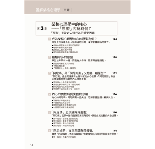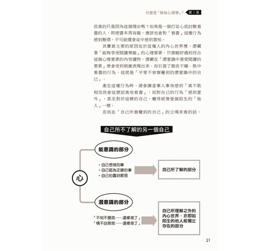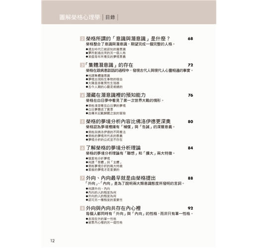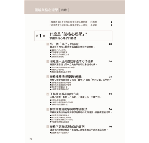 很多人和我一樣,非常敬仰榮格,也很想要透過閱讀接近榮格,了解榮格心理學,了解自己的內心世界,可是卻因為外文原典難以閱讀,翻譯的榮格中文著作也是不容易理解,因此感到十分的挫折。很高興看到這本《圖解榮格心理學》的出版,這是一本以淺顯易懂的解說方式,協助一般大眾能夠很容易地了解榮格心理學的內容。由於原文作者長尾剛先生本人並非心理學家或心理師,反而可以使用很顯淺的文字,來介紹高深複雜的榮格心理學概念和專有名詞。許多深奧難懂的心理學名詞,例如:原型、集體潛意識、人格類型、情結、陰影、阿尼瑪、阿尼姆斯、面具、投射,以及本我等,本書均使用淺顯的文字和圖解方式,加以解釋,幫助讀者很快地了解,這是本書之所以令人親近和喜歡的主要原因。