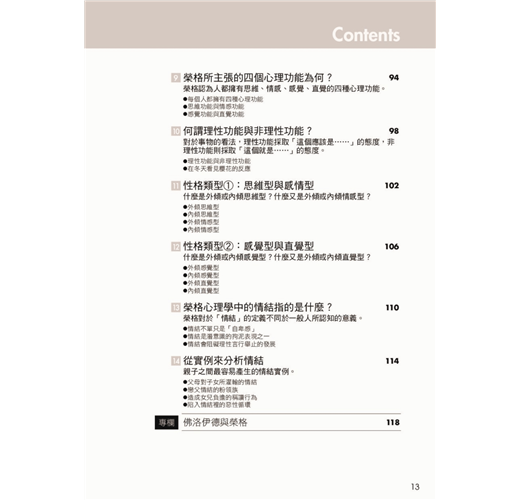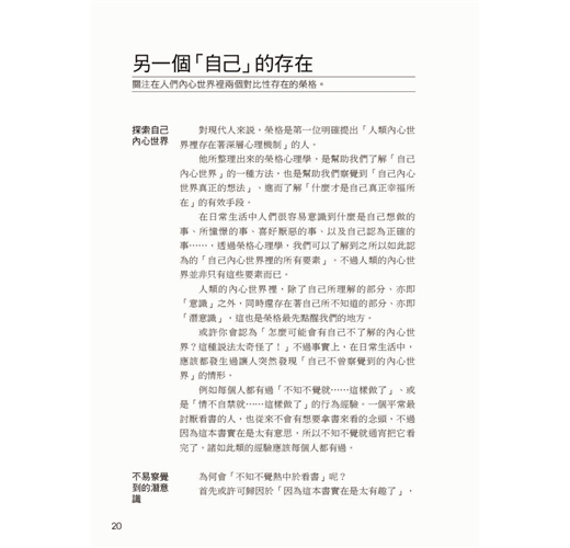 對於想要進修或閱讀榮格心理學的民眾,我覺得本書可以說是一本最適合的入門書,透過本書的閱讀,可以很快地掌握榮格心理學的基本概念。在正確了解這些基本概念和專有名詞之後,就可以進一步閱讀榮格的原典,包括中文翻譯的榮格著作。對於探索自己內心世界和人類心靈有興趣的人,也可以從本書中獲得很多的學習。如何閱讀本書呢?我建議讀者可以逐頁閱讀,也可以挑選自己有興趣的章節閱讀,閱讀的時候可以先看文章再看圖解。對於看不懂的部分,就先暫時跳過去,以後再請教這方面的老師、參考榮格其他著作,或者查閱心理學辭典。我個人認為單獨要靠閱讀進行自我探索是比較困難的,如果能夠配合靜坐來自我沈澱,效果會好一點,若是可以找一位心理師進行自我探索的心理諮商,效果又會更好。不可諱言的,自我探索是人生一輩子的功課,愈了解自己就愈能掌握自己也就愈能有知有覺地過生活和從容地面對世間的一切。
