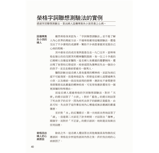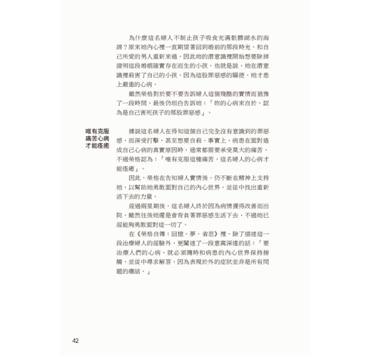 人為什麼會得到心理疾病或心病?閱讀本書可以看到榮格對於心理疾病有其獨到的見解,有別於佛洛伊德認為心病是由於本能與意識的衝突,以及嬰幼兒時期性心理受到壓抑,導致不良的人格發展。榮格認為心病是意識與潛意識失衡的結果、以及內在對比性格的嚴重衝突使然。人既然深受潛意識的驅使和影響,卻又沒有自覺或能力去處理意識與潛意識的失衡和性格的衝突,自然就會形成心理疾病了。榮格不僅解釋心理疾病的成因,他同時也提出治療的方法,例如他會使用對話、造景,以及夢境分析三種方法,來幫助當事人發掘壓抑在自己心靈深處的壓力,探索潛意識世界裡的心病原因。所謂對話,就是使用會談的方式來進行心理諮商;所謂造景,就是使用沙箱或繪圖的方式,來進行自我探索;而所謂夢境分析,就是邀請當事人說出夢的內容,然後進行積極地想像和分析。即使到了今天,這些治療方法仍然被後代榮格心理分析師和一般心理治療師繼續沿用,於此可見,榮格的貢獻不僅是理論上的創新,而且是在臨床心理治療實務上的應用。