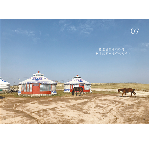 看著成吉思汗的畫像,心想著對剛剛那位女孩感到有些抱歉。我呆坐在蒙古包裡,開始笨拙地把棉被舖好,草原上除了隔壁的蒙古人喝酒聊天的聲音,什麼都沒有。在這種時候,時間總是像隻老烏龜般的緩慢。原來在日常生活中,我們視為理所當然的一切,卻是最重要的。經歷過黑暗的恐懼,就自然會知道珍惜光明。