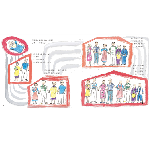 「生命長河」的視覺主題反覆地在書中呈現,溫暖的紅色線條圍住了一個個的世代家庭,讓成員們手牽著手,以親情凝聚家族,把愛傳承下去,並呼應著最後的家族樹。