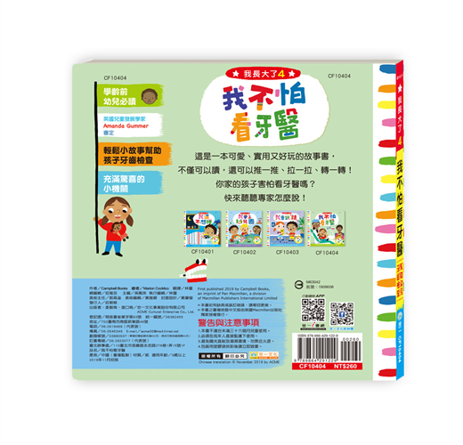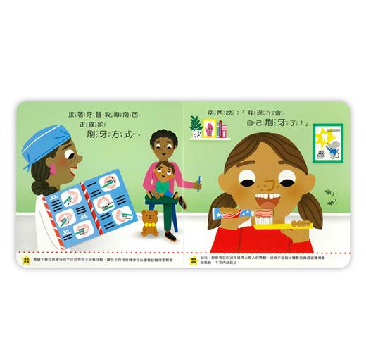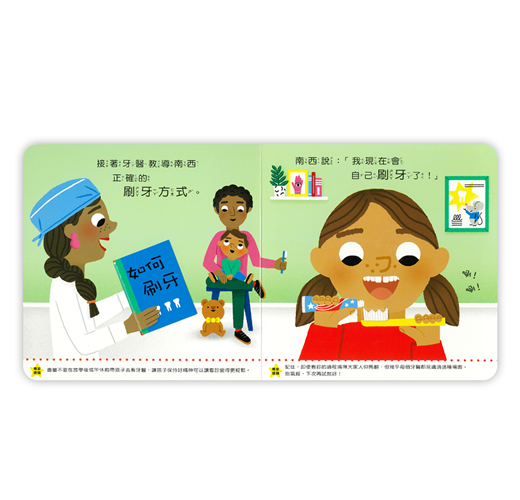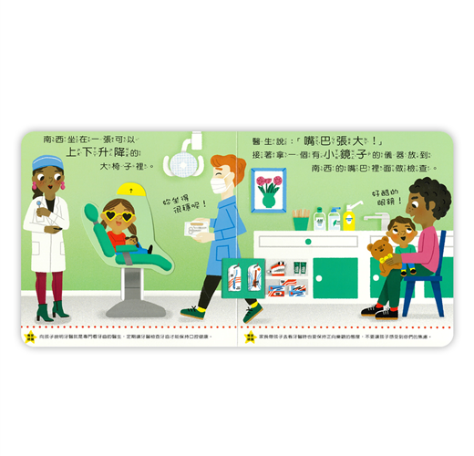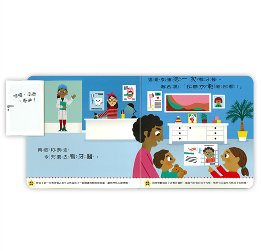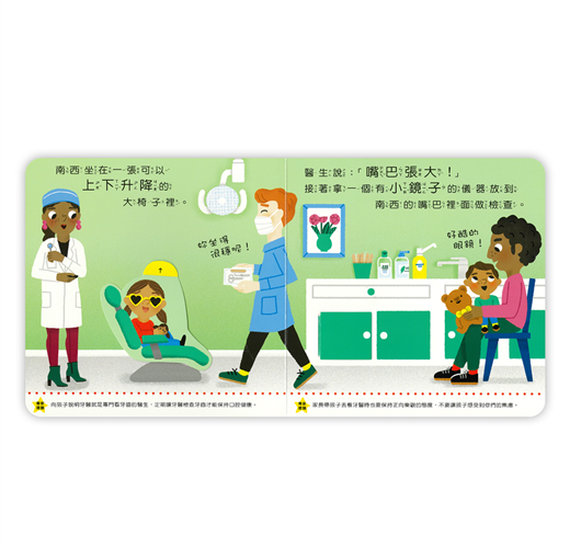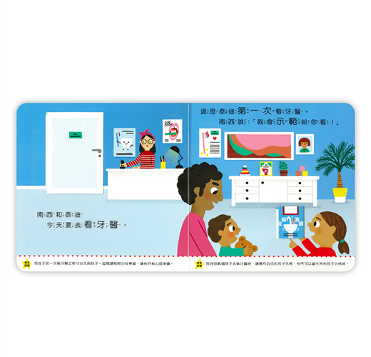 南西和泰迪今天要去看牙醫,這是泰迪第一次看牙醫,姊姊南西自告奮勇當示範。「來,嘴巴張大喔!」南西覺得有點癢癢的,但牙醫準備了一些小道具,讓南西可以轉移注意力,原來看牙醫一點都不可怕!我長大了系列幫助每個頭痛的家長度過難關,建立幼兒好習慣,陪伴孩子快樂長大!.學齡前兒童必讀.英國兒童發展學家審定.小故事幫助孩子牙齒檢查.充滿驚喜的小機關