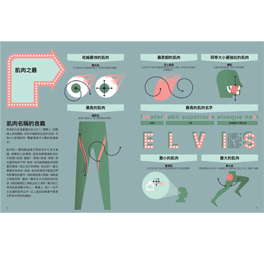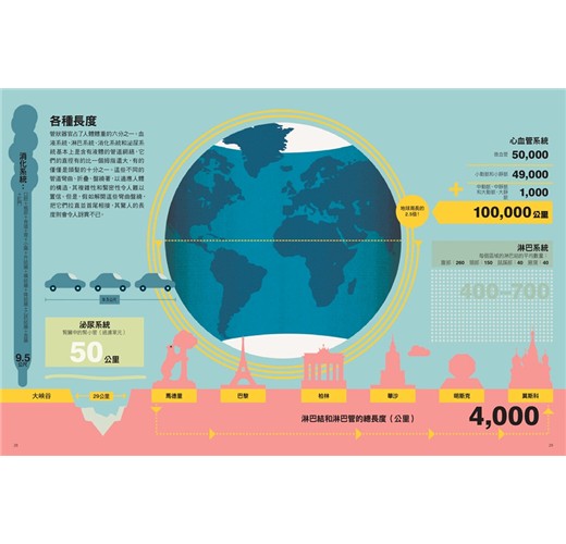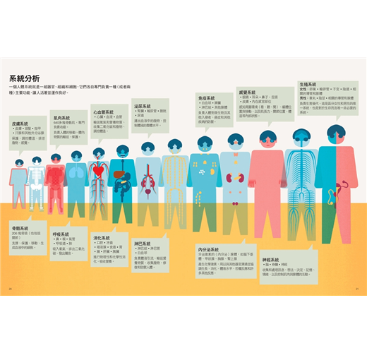 所以,把人體這個主題和資訊圖表結合在一起,應該是不錯的主意。但要怎麼把兩者整合起來呢?許多人體書都會一口氣介紹十幾個功能屬性的系統,例如骨骼、肌肉、心血管、消化、腦和神經等。但是,我們想讓這本書與眾不同。