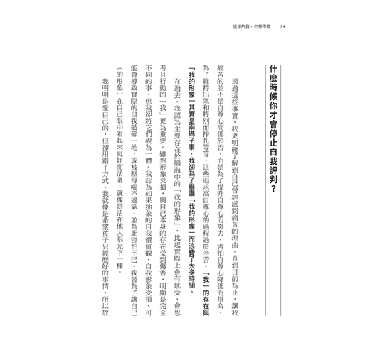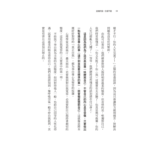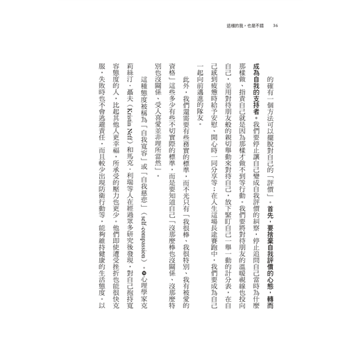 本書將會針對自尊心(self-esteem)、自我慈悲(self-compassion)、不自我批判等貌似語意相近,但本質截然不同的概念進行更明確的說明,並論及實踐的方法。這也是本踏上個人探索之旅的書,希望本書能對所有想要善待自己的人們有所幫助。