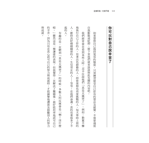 於是,長大後,當我們發現自己並不快樂時,就得把這失落的一塊給找回來,最佳途徑便是懂得「善待自己」。然而,善待自己並不是透過大吃大喝、揮霍無度來犒賞自己的辛苦,這只是在高度壓力下的心理補償,而是能夠在心裡停止自我批判,接納那個不夠好的自己,用白話一點的語言來說,就是「放過自己」。
