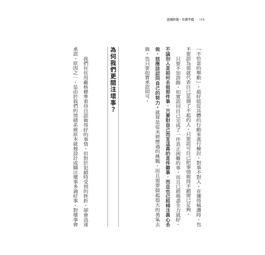 在成長的過程中,我們常只被敦促做到「我行」,但卻少了培養「我不行也沒關係」的情緒承載能力。