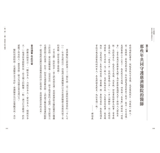 因此,證嚴上人希望我能夠整理過去三十幾年來,尤其是最早期的一些醫療典故。經由那些故事、那些醫師,以及醫院最具有醫療人文的故事,勾勒出慈濟醫療人文的精神。經由這些文字的記憶,也可以讓大家永遠記得慈濟醫院應該是一家什麼樣的醫院。過去如此,現在如此,未來也將是一樣,秉持建院初衷,永遠為苦難眾生而努力。
