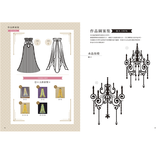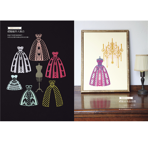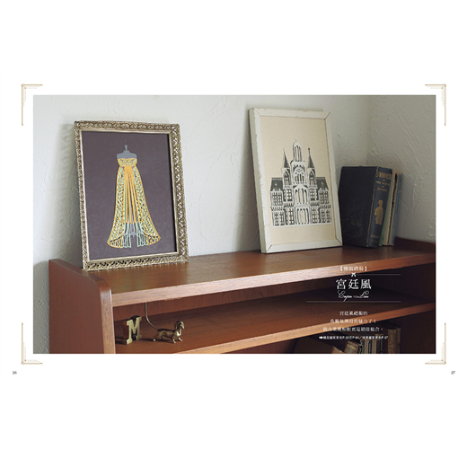 而除了禮服主題的圖案之外,也收錄了許多人氣小物圖案,如鴿子、水晶燈、邊框、寶石……等細緻華麗又萬用的搭配元素,可以單獨使用,也可以與完成的禮服紙雕共同配置出更有主題性的畫面,作為婚禮裝飾‧卡片設計‧畫框藝品,都將令人感到驚艷與讚嘆。